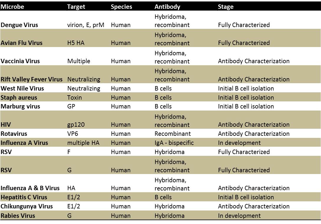 Summary Using human B cell hybridoma creation, and antibody engineering technologies, Dr. James E Crowe Jr.'s laboratory has developed an array of antibodies from full length human antibodies to Fab fragments and diabodies. Many of these antibodies are ready for a cooperate partner who can further develop these antibodies into biologic therapeutics. The table below is a sample of the antibodies they are currently researching and have available. In addition to these areas of research, Dr. Crowe is actively seeking collaborative opportunities to identify new interesting targets for future antibody engineering projects.