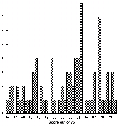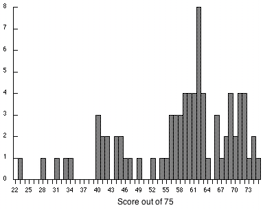 mean = 58 out of 75 (77.3 %), std. dev. 12 (16 %)