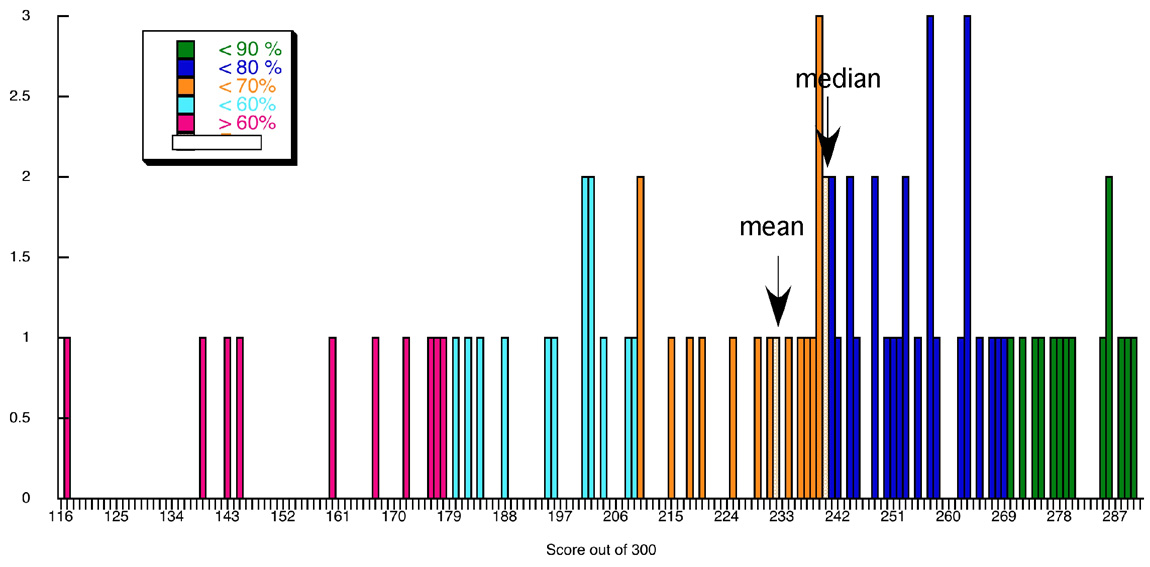 Mean = 232 out of 300 (77.3 %); std. dev. 40 (13.3 %)