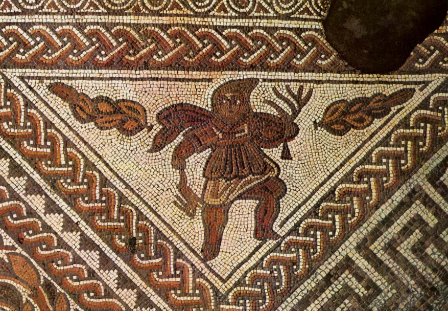 Figure of "Winter" in dining room floor mosaic, Chedworth Roman villa.