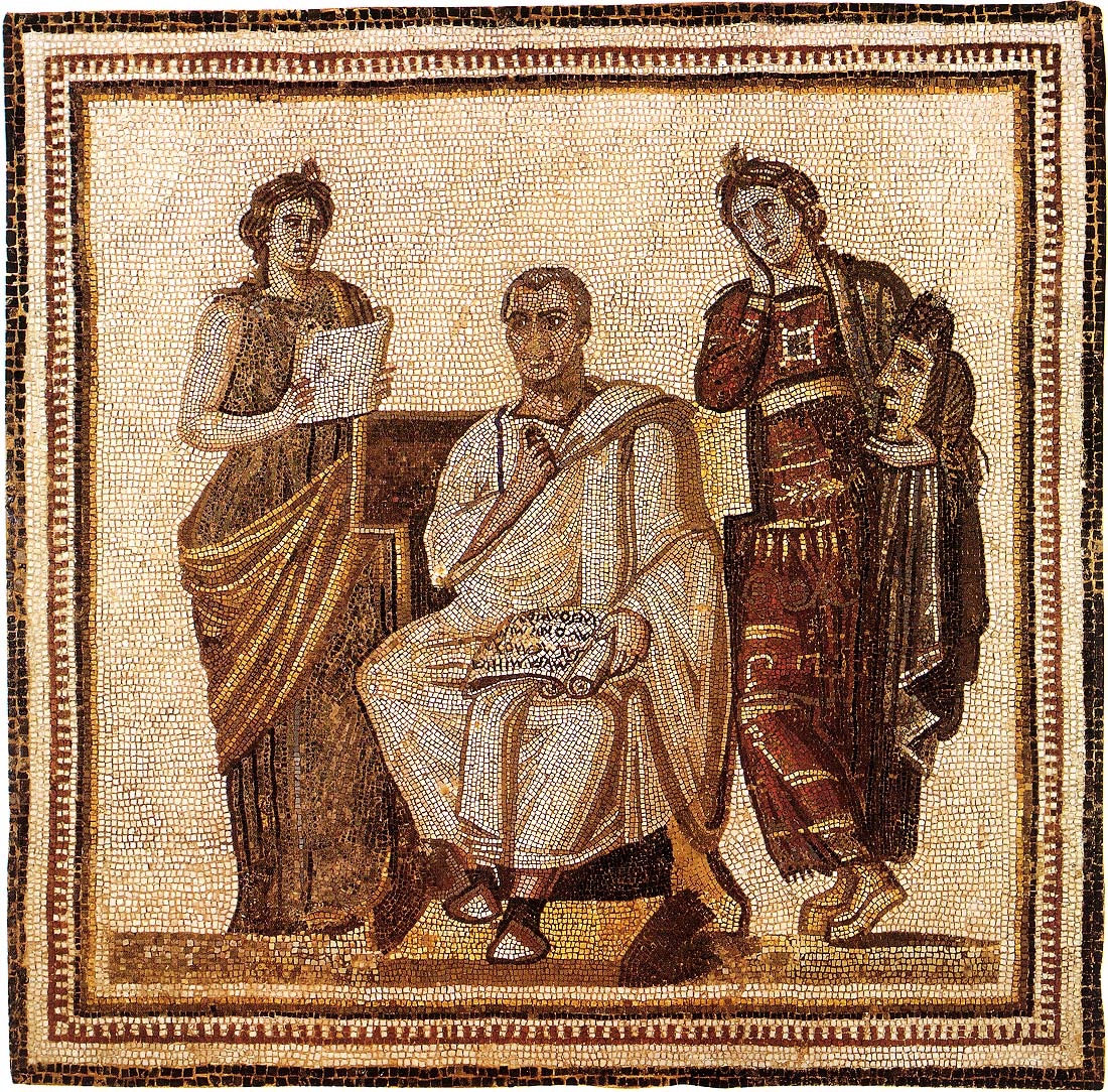 The poet Vergil composing the Aeneid, flanked by Clio and Melpomene, muses of history and tragedy (Bardo Museum)