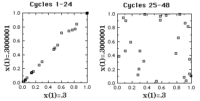 So what? Well, it means that a chaotic system, even one determined by a simple rule, is in principle unpredictable. Say what? It is unpredictable, "in principle" because in order to predict its behavior into the future we must know its currrent value precisely. We have here an example where a slight difference, in the sixth decimal place, resulted in prediction failure after 24 iterations. And six decimal places far exceeds the kind of measuring accuracy we typically achieve with natural biological systems.