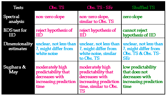 Table 4. Summary of Results.During the intervening time, I have had the opportunity to apply the discussed tests to the remaining 11 participants' data sets. All but the dimensionality conclusions appear to be supported. The results from the dimensionality tests do not suggest a difference between the three file types and neither observed time series appears to have a dimensionality less than 7. Click here to return to the original conference paper.