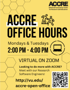 Looking to do more with ACCRE? Join us virtually on Zoom on Mondays and Tuesdays from 2-4 PM for Open Office User Support with our Research Software Engineers! Looking to learn more about ACCRE? Join us virtually on Zoom on Wednesdays from 2-3 PM for Open Office Consultation with our Research Facilitator & Program Coordinator! Register for a 30-minute time slot here: http://vu.edu/accre-open-office