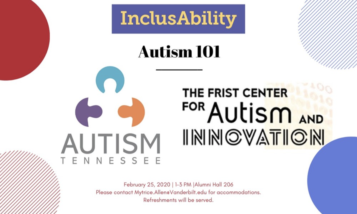 “Autism 101” will take place in Alumni Hall 206 from 1 p.m. to 3 p.m. on Tues., 2/25 and will include free snack food. InclusAbility is an initiative sponsored by Vanderbilt University’s Office for Inclusive Excellence. The next InclusAbility event be on Tues., 3/10 at 1 p.m. and will also feature Autism Tennessee and the Frist Center.
