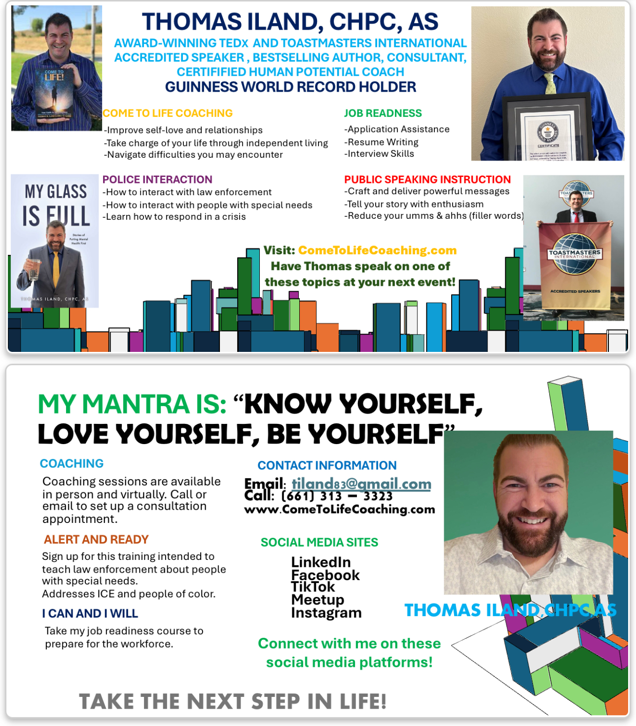 THOMAS ILAND (pronounced like "island"), a Certified Human Potential Coach and the only Toastmasters International Accredited Speaker with autism in the world, offers Come To Life Coaching, which enables clients to realize their potential in areas such as love & relationships, independent living, further education, and employment.