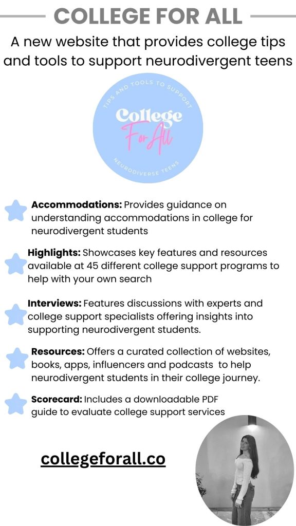 The College For All website is a new website that provides college tops and tools to support neurodivergent teens, including: