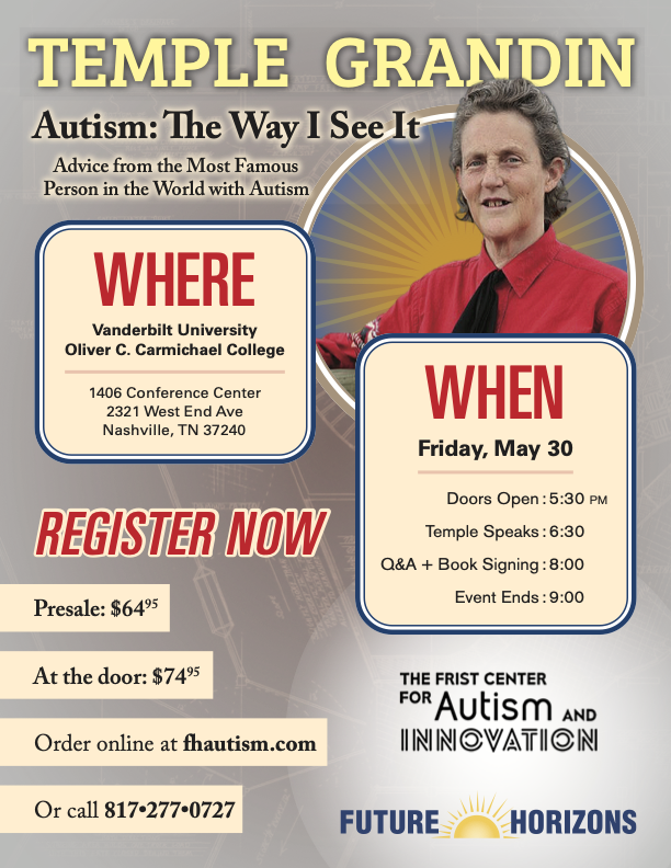 Don’t miss your chance to come and hear from Temple herself in this event titled “Autism: The Way I See It” on May 30th, where Temple will speak, followed by a Q&A and book signing.