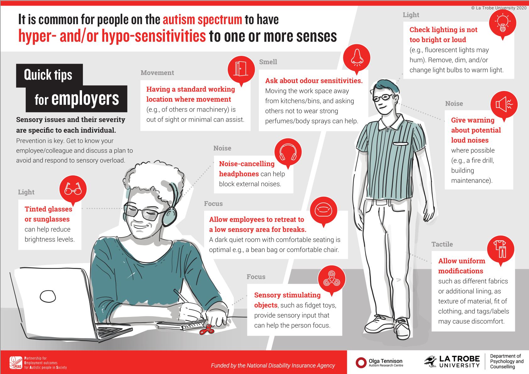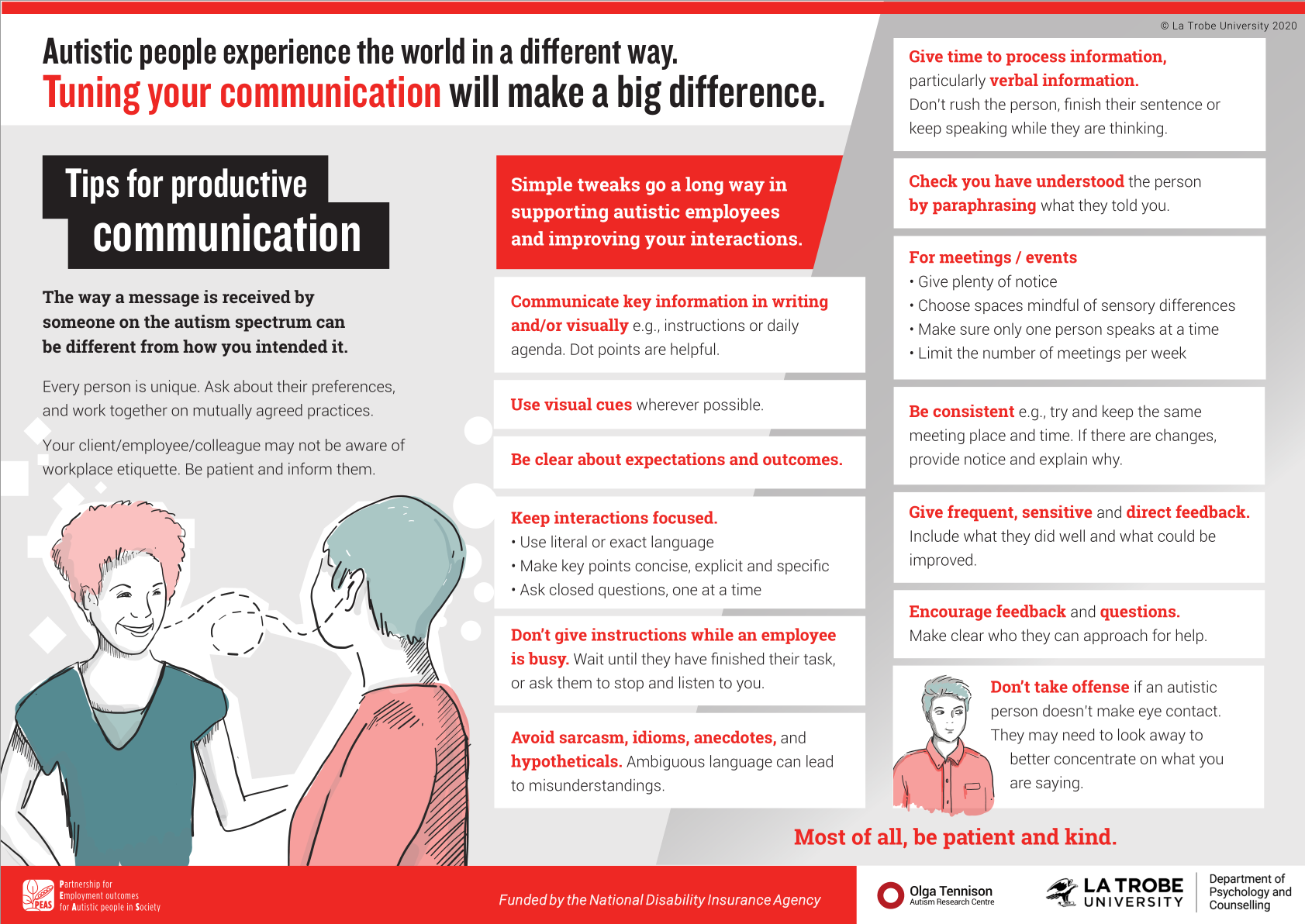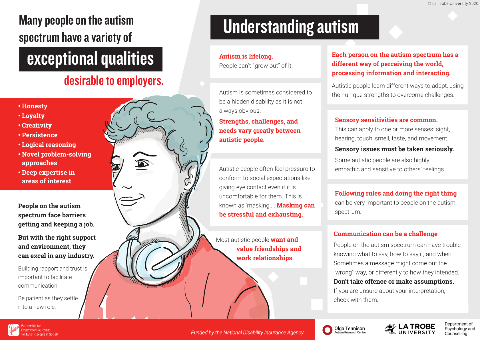 La Trobe University, partnering autistic self advocates and experts, created a series of informational tip sheets to provide key information to help employers understand and support autistic employees. These resources are freely available, and you can learn more about them by visiting this page on their website. These four tip sheets may be viewed and downloaded below.