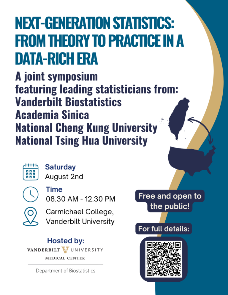 It is our very great pleasure to bring together leading statisticians from our graduate program, Academia Sinica, National Cheng Kung University, and National Tsing Hua University to the Vanderbilt University campus on Saturday, August 2. The detailed agenda for the morning can be viewed on our symposium page. We hope to see many of you there!