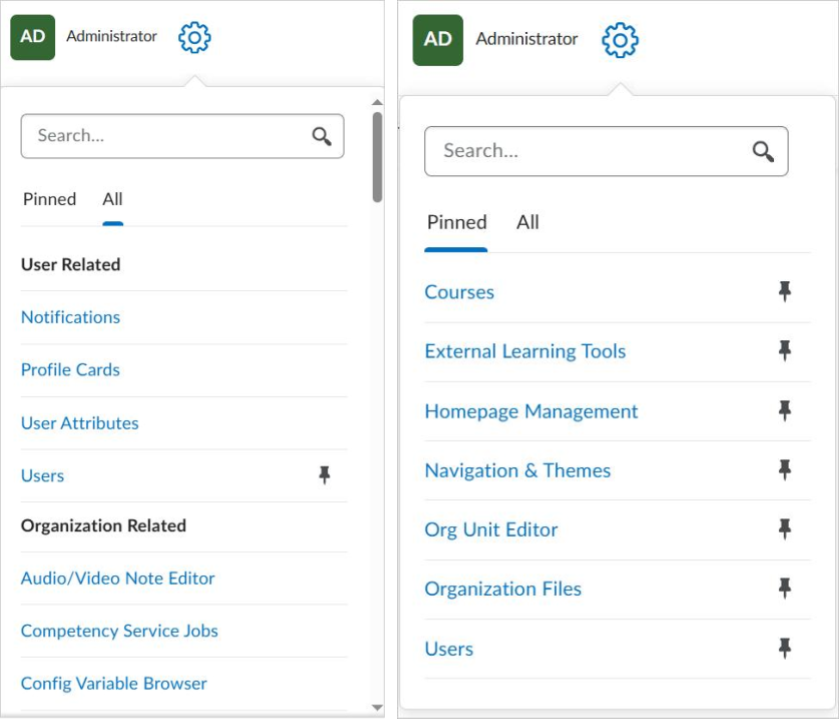 Figure: The new Admin Tools menu allows Administrators to quickly search for tools, pin them to the Pinned tab, or review the All tab for a categorized list of tools for easy access.