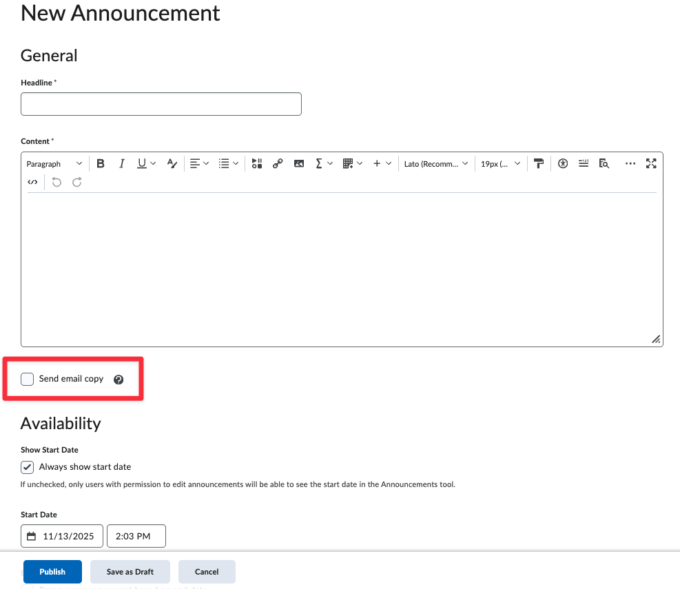 In the user interface for creating or editing an announcement, a new Send Email Copy checkbox now appears when an instructor creates or edits an announcement.