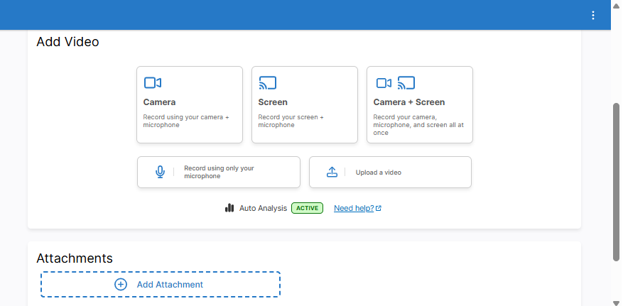 Once you scroll down, you will see the option to record video directly or to add other content for submission to the video assignment. If you plan to submit a video file to this assignment, we would generally recommend clicking ‘Record video’.In some cases, however, you may want or need to submit a video assignment in other ways. If you click ‘Upload Video’, you can choose from uploading a video stored locally on your computer.