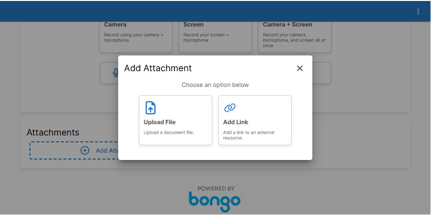 If you need to upload a file such as a PDF or Word document, or add a link to a video hosted externally outside of Brightspace. Click ‘Add Attachments’ and select either ‘Upload File’ or ‘Add Link’.