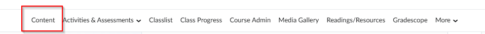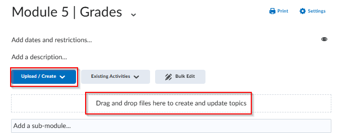 You must create a module before you can add topics (content items). You can create sub-modules (modules within existing modules) to establish a deeper hierarchy. Once you create modules, you can add dates, restrictions, or a description, and you can populate them with topics. You can drag and drop files from your computer into a module, or you can select from the Content tool’s New and Add Activities buttons to create new topics or add existing course objects.