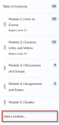 2. Under Table of Contents, enter a module name in the Add a Module field found at the bottom. Hit Enter/Return when you’re done to create the module.