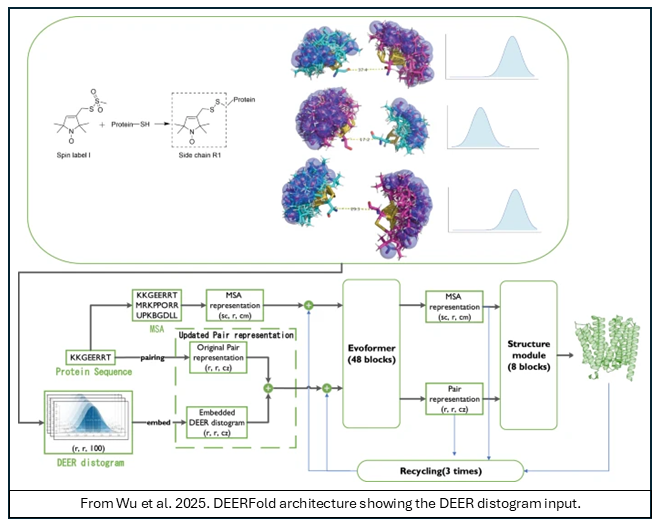 DEERFold’s success shows that AF2 can be molded to include many other forms of experimental data, such as nuclear magnetic resonance (NMR), fluorescence resonance energy transfer (FRET), hydrogen-deuterium exchange (HDX), and cross-link mass spectrometry (XL-MS).