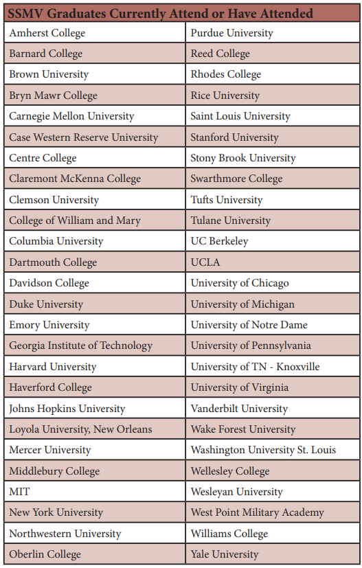 The SSMV will prepare students to successfully engage in college studies, promote pursuit of graduate, postgraduate and professional study, and provide the strong foundation crucial for career success. This unique program is limited to 26 students per grade, and only those attending an MNPS school are eligible. To ensure every qualified student who is chosen can participate, there is no charge for the program.