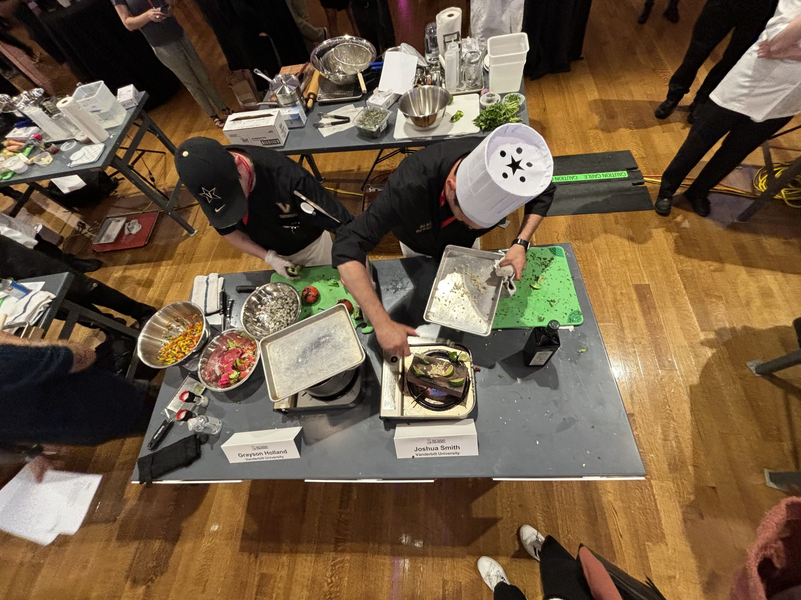 Vanderbilt Campus Dining chefs Joshua Smith and Grayson Holland showcased their culinary prowess at the UMass Chef Conference Tournament of Champions this week. The cooking competition was hosted by chef Jet Tila and followed a format similar to Food Network competitions. Chefs Josh and Grayson competed as a team against six other colleges and universities under a 30-minute time frame with unique challenges and a randomizer wheel that dictated the proteins, produce, equipment, and cooking styles.