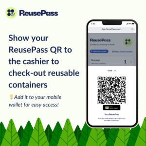When you arrive, the cashier will scan your ReusePass QR code on your mobile to confirm your involvement in the ReusePass program, and will give you a new, clean, to-go container. Simply fill your container and head on your way!
