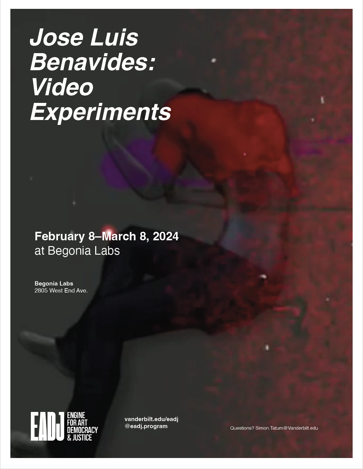 Vanderbilt Faculty, Jose Luis Benavides will have video and mix-media projects on exhibit at Begonia Labs. He will also host a series of conversations and film screenings with partner programs and his creative collaborators during his time at the art laboratory. Benavides has been exploring the relationship and tension between new media (3D animation and 3D printing practice) and old media (archives and research-based practice) alongside themes of social justice, queer temporalities, Latinidad, and immigration through experimental documentary filmmaking and video art techniques.