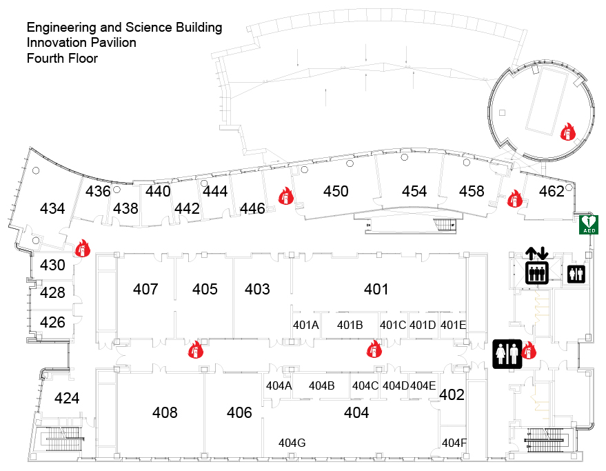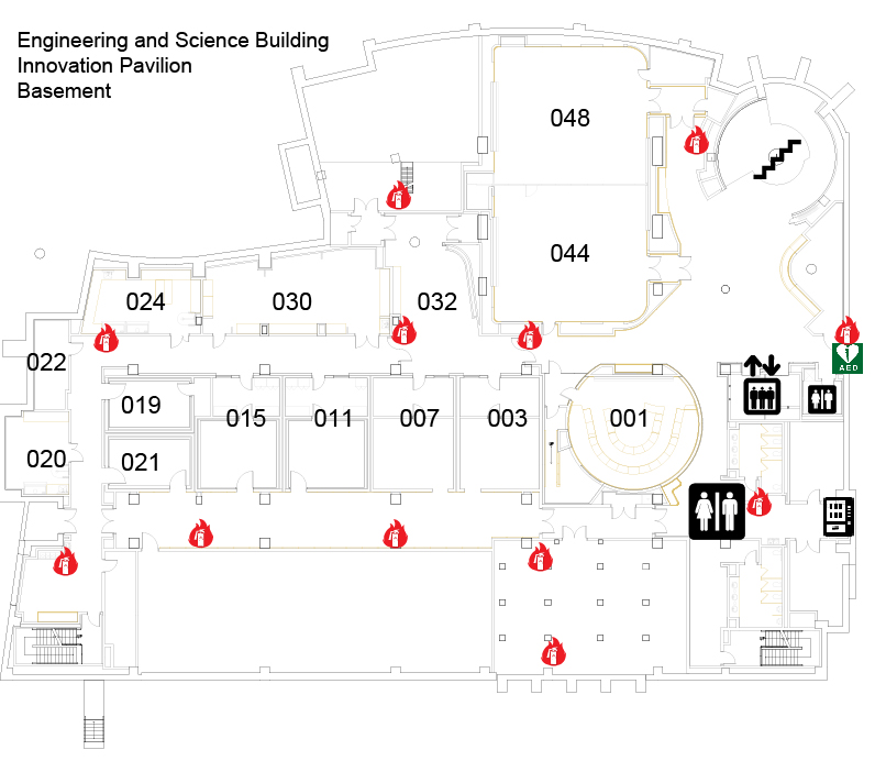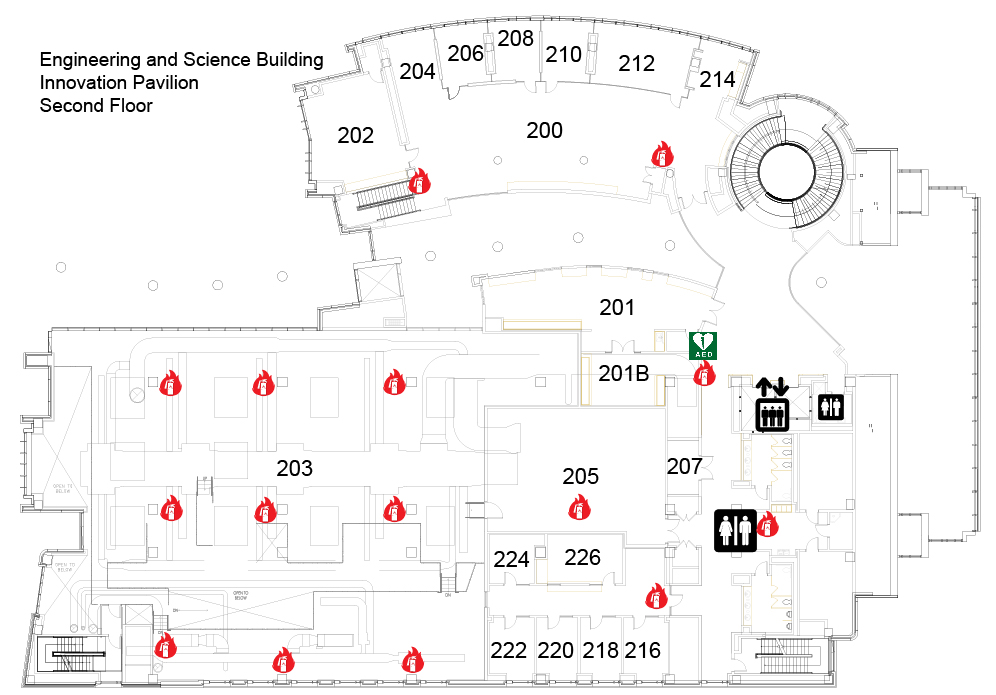 Engineering and Science building has placed AEDs on every public floor (basement, first, second, third, and fourth) to assist those trained in CPR and defibrillation in the crucial minutes and seconds before an ambulance arrives. These are all located within view of the elevators, specific locations shown below.