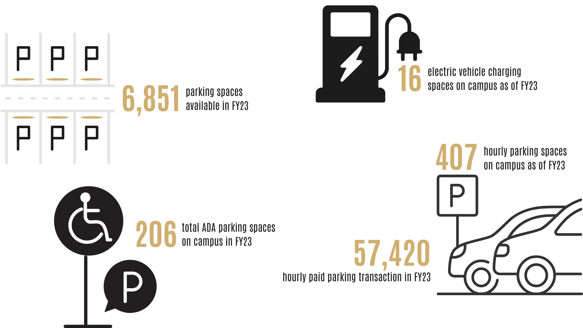 407 hourly parking spaces on campus as of FY2023