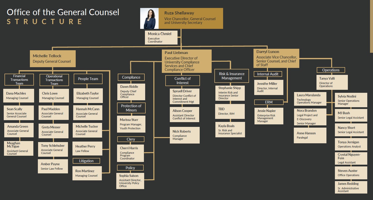 | Michelle Tucker Associate General Counsel 615-343-4620 michelle.l.tucker@vanderbilt.edu Biography | Litigation Student Affairs Title IX | Marita Bush 615-343-3804 mj.bush@vanderbilt.edu |