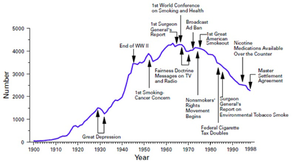 Exposure to tobacco: Although human use of tobacco dates back thousands of years in the western hemisphere, worldwide spread did not begin until October of 1492, when Christopher Columbus received tobacco from the Arawak natives of the West Indies. By 1600, tobacco had been introduced to countries throughout Europe, and to Persia, India, Japan, China, and regions of Africa. Despite this rapid dissemination, however, the modern widespread practice of tobacco smoking was delayed until 1880, when James Bonsack patented the first machine to manufacture cigarettes. The first 50 years of the 20th century saw the rapid adoption of cigarette smoking in industrialized countries, and cigarettes remain the primary means of tobacco consumption today. In nearly all cultures, increases in smoking have occurred first among men with use by women increasing later and usually to a lesser degree. The overall consumption of cigarettes in the United States peaked in 1965, coincident with the first Surgeon General’s report on the hazards of smoking (Figure 8). However, increasing use of cigarettes in developing countries has kept global consumption on the rise. Today, there are 1.2 billion smokers worldwide, representing 29% of the population over 15 years of age.