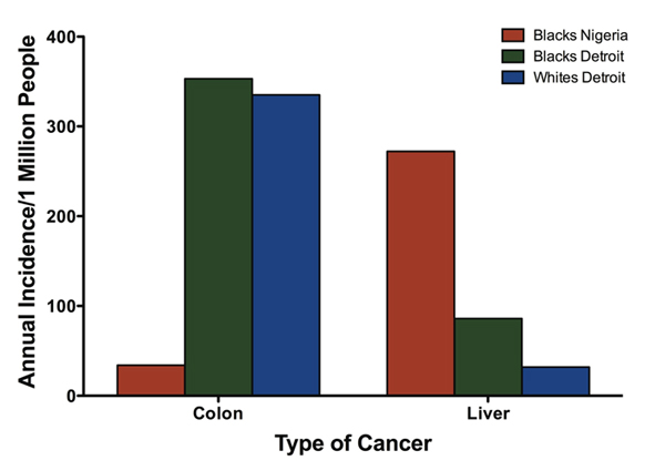 - The change in cancer incidence rates that occur when people migrate. Usually, when groups of people migrate from a region of low to high (or high to low) incidence of any type of cancer, their risk for that form of cancer becomes similar to that of their new location. Sometimes this takes several generations to occur, but the fact that people exhibit the cancer risk that is associated with their location rather than their ethnicity suggests that the differences in risk are due to environmental factors rather than genetics. Examples include cancer incidence rates among black Americans, which more closely resemble those of white Americans than black populations in Africa (Figure 2), and rates among Japanese residents in Hawaii, which more closely resemble those of white populations in Hawaii than Japanese populations in Japan.