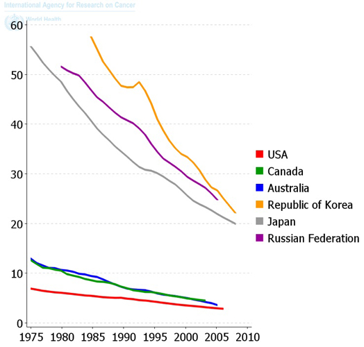 - Changes in cancer incidence over time. These data must be interpreted carefully, because factors such as improving diagnostic techniques and an aging population can affect cancer incidence statistics. However, time trends such as the increase in lung cancer with the increase in cigarette smoking and decrease in stomach cancer with better food preservation methods (Figure 3) help to illustrate the role of environmental and life style factors in causing cancer.