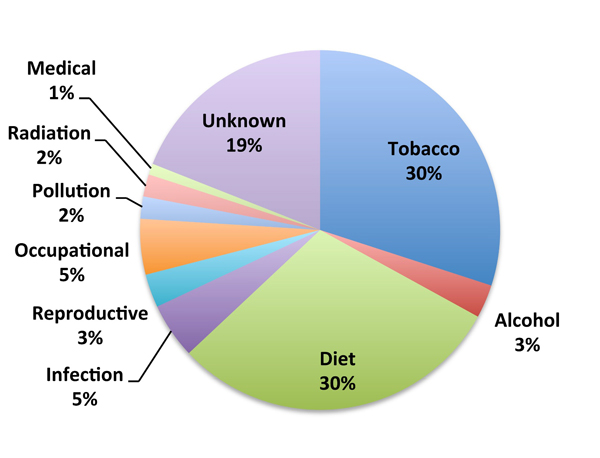 - Diet, cause of ~30% of preventable cancer deaths. Diet can influence the development of cancer in multiple ways, such as: