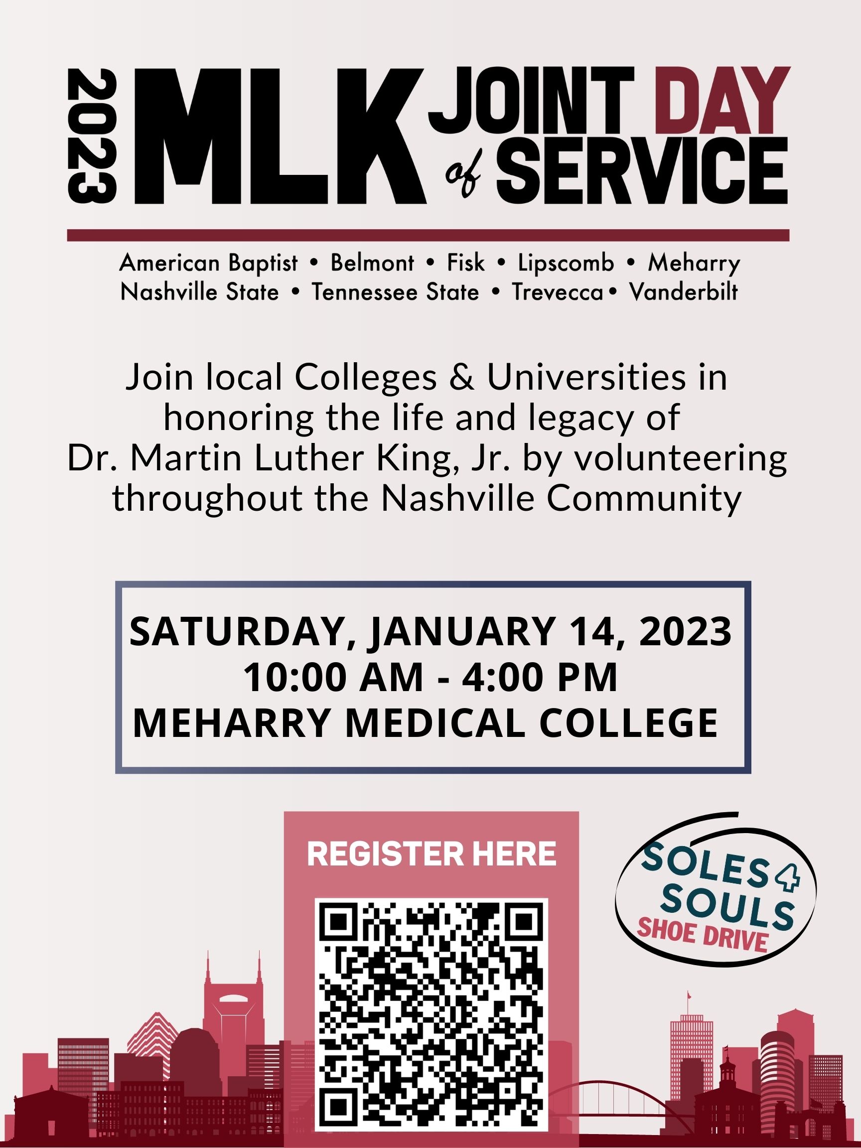 The annual MLK Joint Day of Service brings together hundreds of student volunteers from Nashville-area colleges and universities to continue the dream of Dr. Martin Luther King Jr. through service. This year’s event will be on Jan.14 beginning at 10 a.m. at Meharry Medical College, 1005 Dr DB Todd Jr Blvd in Nashville. Following the opening program, volunteers will be bused to different service sites. Lunch will be provided.