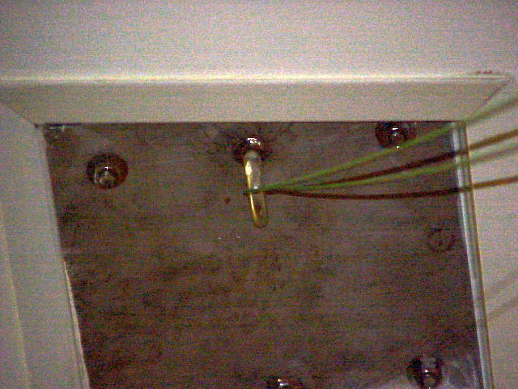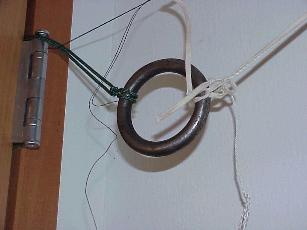Instructions![]() The photos show apparatus for illustrating free fall and constant acceleration. The fourth photo shows the biner variation of attachment point . Two long (35 or 40 feet) pieces of rock-climbing accessory cord that have five large and one small fishing weight attached to each are seen in the first photo. The light- green cord has the weights tied at linearly increasing multiples of the spacing of the first weight from the small -locating-weight end. The orange cord has its five large weights tied such that the second one is at 4 times the distance of the first, the third at 9 times ,…, the fifth at 25 times the distance of the first from the small-locating-weight end. The dark green cord( seen in photos 2 and 3) : 1) is permanently closed- looped through the ring in photo 2 (which is fastened to the lecture hall ceiling). (Please do not under any circumstances untie this closed loop!) When one of the fishing-weight- loaded cords seen in photo 1 is threaded through an elevation attachment point as shown schematically in the diagram below photos 1 and 2 for the ring elevator, then that loaded cord may be raised to ceiling level by rotating the cord tied to the ring to raise the ring while paying out loose line on the weighted line to keep its' appropriate weight ( i.e. the one which is 5 or 25 times the locating distance from the weighted end) at the level of the ring. When the fifth large weight on the light-green-cord is raised about 16 feet above the floor , one may release the end of the unweighted half of that cord to allow the weights to free fall onto a metal shelf on the floor. The careful listener will discern an increasing tempo of collision noises in this case. The orange cord produces an even tempo of collision noises (one about every fifth of a second). A pop bottle has a hole in its side and another in its lid, so that when filled with water and both holes opened a nice stream is emitted from the hole in the side. However, if the bottle is tossed up into the air, no water streams out during the entire free fall motion of the bottle, especially not at the top when the velocity is instantaneously zero.