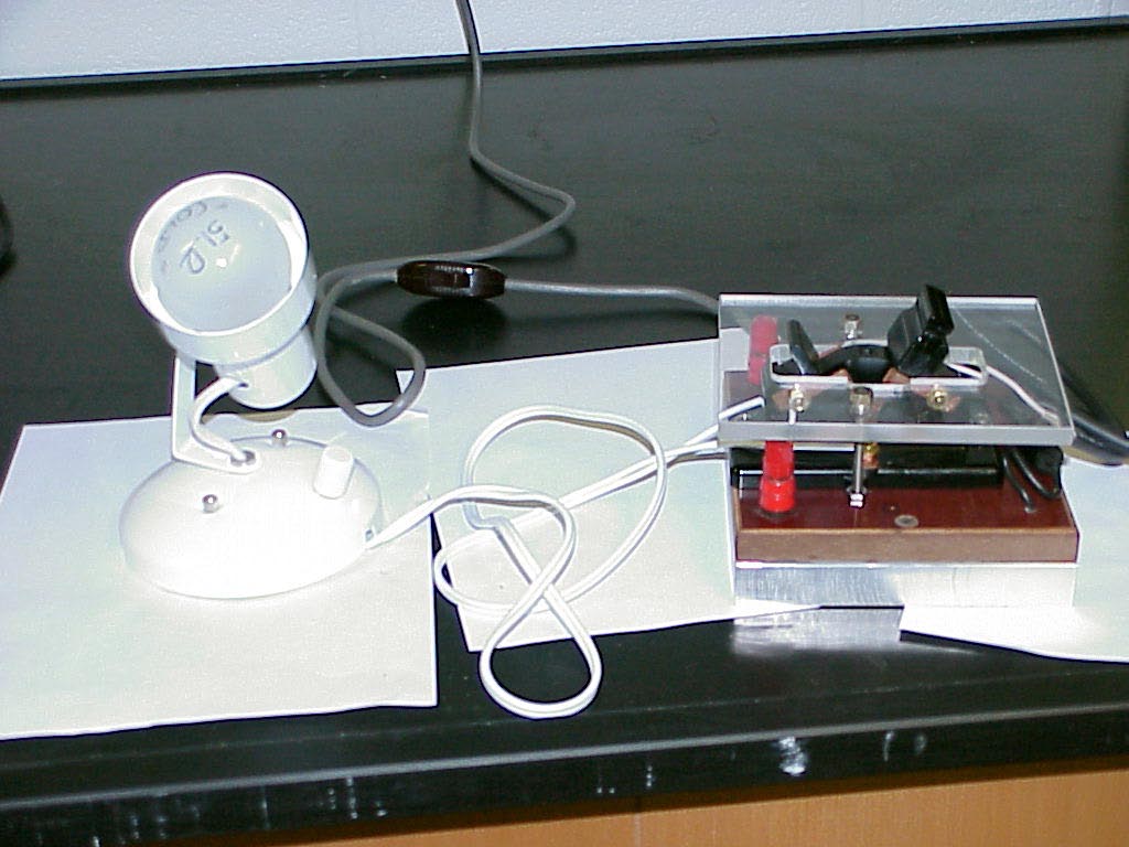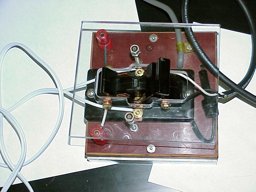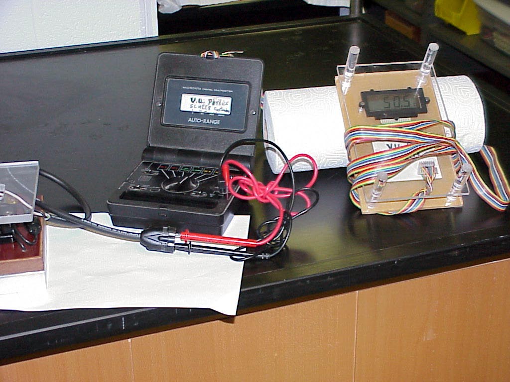 InstructionsPhotos shows apparatus for measuring resistance of incandescent light bulb filament both in its room temperature state and as a function of time immediately after it is switched off. The bottom photo shows the basic hookup of the multimeter. The top left photo gives a view of the lamp hookup. The top right shows the dedicated switching hardware. The bottom photo shows the output stage of the multimeter on the right , which may be placed on the overhead in the lecture room to let the class see the resistance values of the bulbs as a function of time after being switched off. There is a carbon-filament bulb (whose resistance goes down when heated) in the brown cardboard carton in the bottom left photo. For a given bulb, when the room temperature resistance is measured, one should slide the meter switch to" range- hold", so that a larger range of the transient resistances during the cooling cycle can be seen on the overhead projection screen. SAFETY WARNING: Exercise great caution in showing this demo as there are bare conductors somewhat available with 120 VAC on them at times! |
