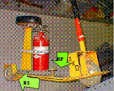 InstructionsThe photos show the relevant parts and force labels for using the rocket cart (without benefit of motor) to illustrate the above concepts. The demonstration consists of sitting on the cart and propelling oneself in the forward direction or in the rearward direction . One brakes briskly to a halt in each case while firmly holding both handgrips. The results are that one comes to a straight-line uneventful halt in the forward case, but one pops a wheelie (front wheel leaves floor) and the front end spins to the left in the rearward motion case. (FI, HHB) is the label for the inertial force exerted on the handgrip by the hand in the direction shown (i.e. to the rear) during the course of the stop for the rearward motion case. (FF, BW) denotes the friction force exerted on the brake wheel (BW) during the course of the just- mentioned stop. (BP) shows the brake pedal, while (BS) points out the brake shoe. ((BS)’s lack of a mate (brake shoe) on the left rear wheel and the singlet front wheel are of course the source of some of the asymmetry in the carts forward and rearward braking motions.) One may point out the general result that the normal force at the “forward axle” (relative to the direction of motion) increases during deceleration from constant speed. This fact can lead to a real-world example of mechanics in action (sometime during a four year residency at Vanderbilt one will probably see at least one rear end collision on West End in which the front end of the rear car will be hung under the rear end of the front car ). The unbalanced torque of the frictional braking force on the right rear wheel will cause a rotation of the entire rocket cart system unless there is sufficient transverse friction force on the front wheel to cancel it. However friction forces have maxima limited by normal forces. By noting the direction of friction forces exerted on driven wheels, one can connect the wheelie to the motions sometimes observed at real world drag races. |