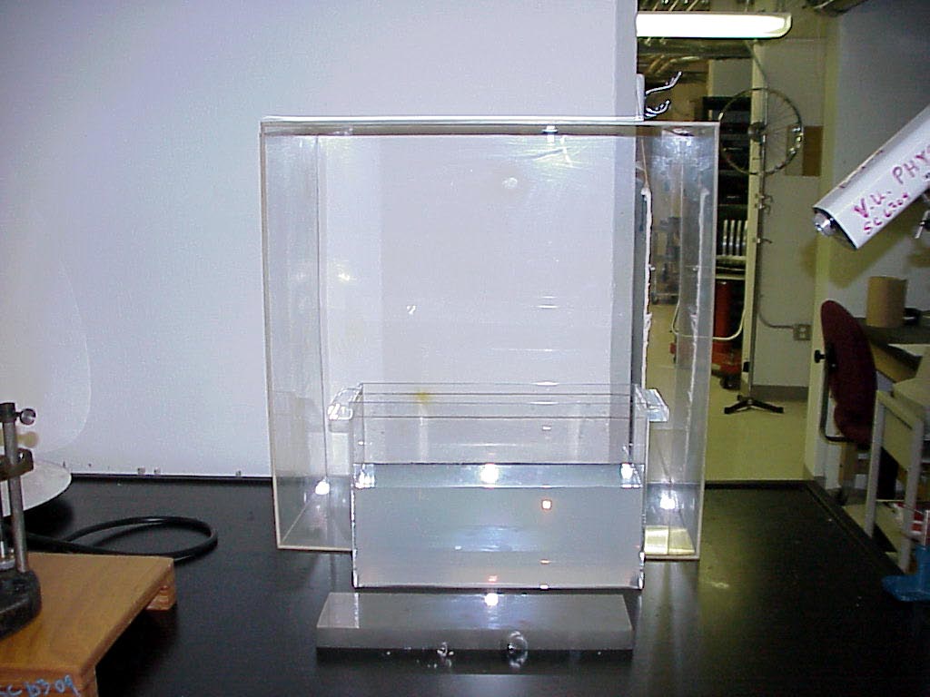 Demo DescriptionOne utilizes one half of the smoke box, a flat mirror and a tank of water to show the laws of ray reflection from a planar surface and of ray refraction on entering a different medium. |