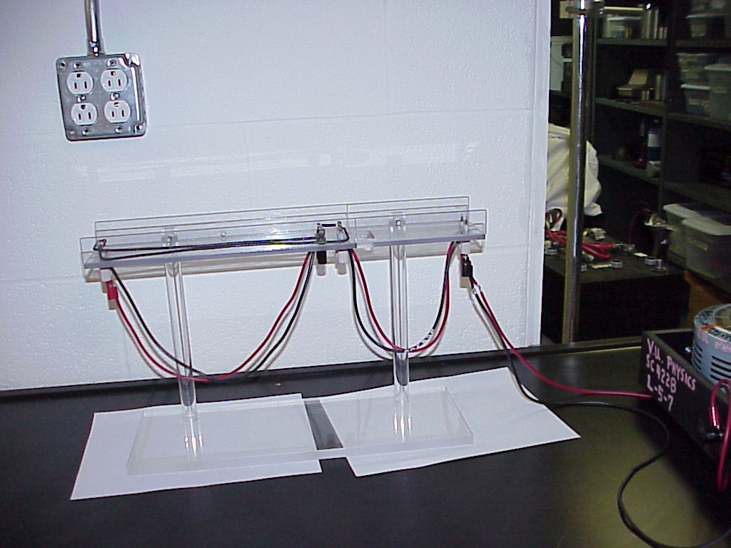 Demo DescriptionCurrent is sent through two sets of parallel hanging wires using a large Variac. The middle photo shows the state of the wires with no current flowing through them. The bottom left photo shows the "current-on" state of the two sets of wires. Notice that the longer set is now sucked together and the shorter set is pushed apart. Of necessity, from viewing the hook up to the power supply, the shorter set of wires must have their currents anti-parallel. Noting that the shorter set are indeed pushing each other apart, means that internal wiring must have the currents parallel in the longer set of wires, since the longer set of wires are indeed pulling each other together. |