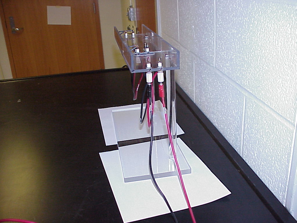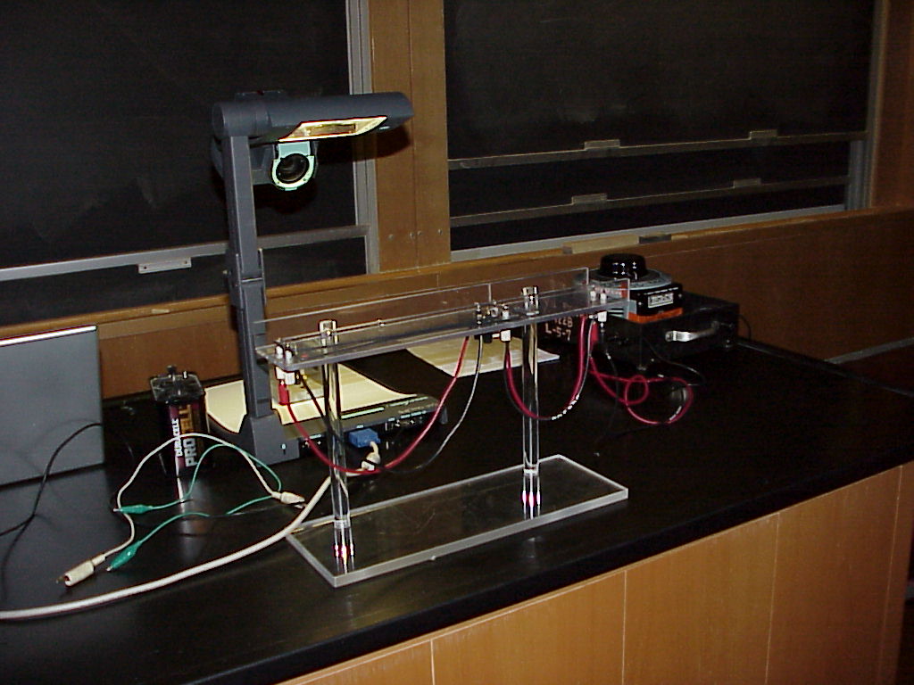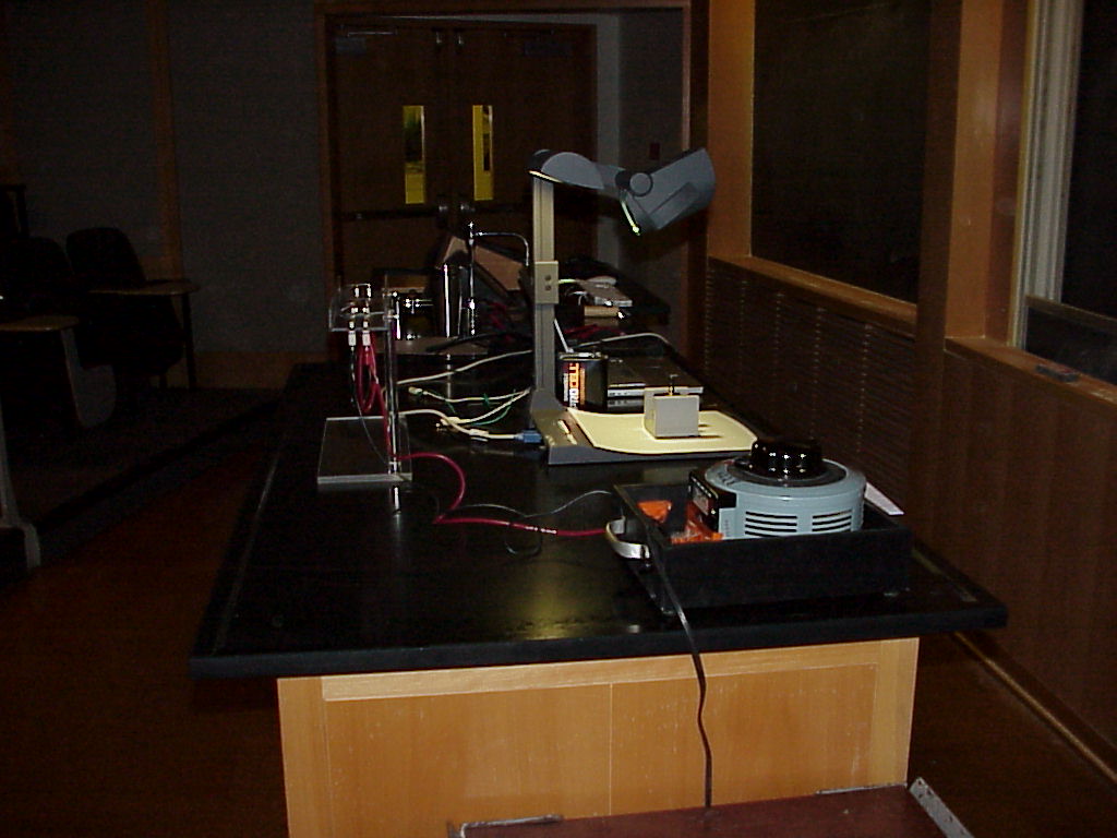 InstructionsThe pictures show apparatus for demonstrating forces between two current carrying wires. For large impulsive currents, the large Variac must be ONLY quickly pulsed up to about the 20% mark and back down IMMEDIATELY or the fuse will blow. For steady state currents the Variac may be set on the10% mark for up to a minute. The two sets of wires need to be televised for optimum visibility in large lecture halls. However this new plexiglass modification of the hanging mechanism is about ideal for using the document camera or overhead projector instead of a video camera. The forces of repulsion and attraction are quite small for realizable , non-destructive currents. This necessitates extreme attention to the exact electro-mechanical hookup and choice of the wires and power supply.