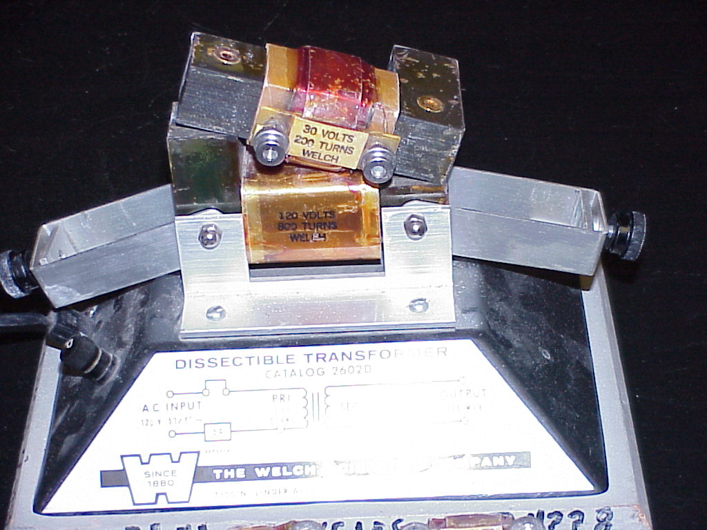 Demo DescriptionShow the components of a transformer by separating the primary coil from the iron core and the secondary coil. Demonstrate the advertised step down mode of the transformer. Then use a Variac to run transformer as a step up transformer. |