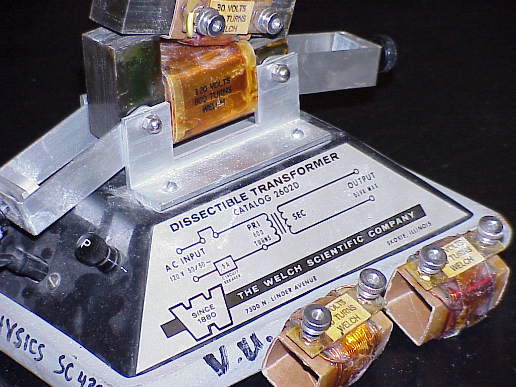 InstructionsPhoto 1 shows the OEM information detail and two of the three secondary coils. Photo2 shows the third secondary coil [mounted on half of the laminated-iron transformer core]. This third secondary coil is ready to be rotated 90 degrees about a horizontal axis and locked in place by the two pivoting Aluminum U-Bracket-Iron-core keepers. Photo 3 shows the AC input cord plugged into the left side of the transformer base. One may of course use the overhead projector modified digital multimeter from Kit(051) to let the class see that the output voltages are as advertised. To demonstrate the reversibility of this process proceed as follows. With the wall outlet end of the transformer AC input cord unplugged , one may carefully hook the variac to a secondary coil. One may the turn the variac up to actually supply the advertised secondary coil voltage to the secondary coil. Then careful attachment of the digital multimeter leads to the wall outlet end of the unplugged AC input cord of the transformer will verify that the nominal wall voltage of 120 VAC is now appearing across the bare plugs. |
