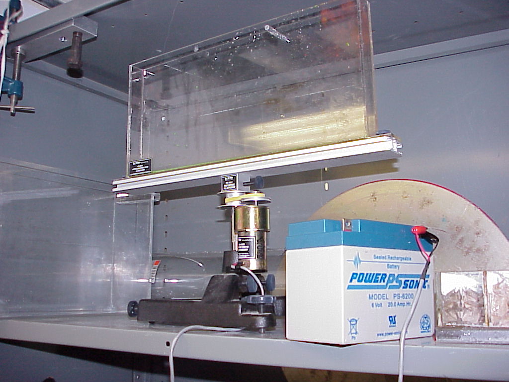 Hanging the block in the water tank (keep balance dry please!) one finds it to weigh only about 1N while submerged. Balance and Archimedes block should be in Kit (102) on [F-2-5]. The “lodestone/ petri dish boat” resides in Kit (060) in [B-2-5] . The Water Vessel is in Kit (053) on [C-1-5]. Ice cubes need to be brought from home by the lecturer. _______________________________________________________________________________________________ Part BSurface of Water in a Rotating TankOne may take a thin open- topped plastic box as seen in the following photo and place enough water inside it to fill it about half way to the top. Subsequent rotation of the box about a vertical axis through its' center will cause the waters' top surface to assume a parabolic shape with the steepness of the parabola increasing with the angular velocity of the plastic tank.One may use the battery shown (12V rechargeable) to gently spin up the tank by the motor coupled to the tank shaft pulley with a rubber band belt. The tank and frame live in [C-4-4].