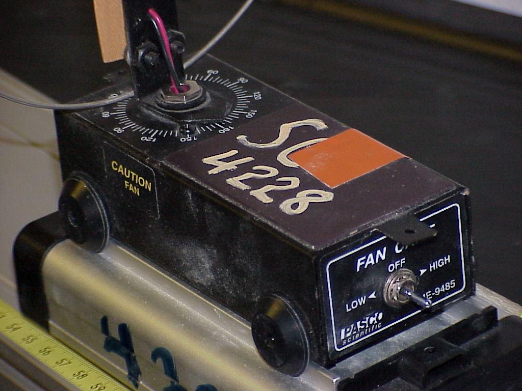 One thus has all the experimental ingredients for demonstrating F=Ma for the horizontal motion of the Fan/Cart system. The switch allows variation of magnitude of force for a fixed mass. The fan cart hitching a ride on top of the plain cart, or not, allows for variation of mass for a fixed force. The variation of the angular position of the plane of the fan about a vertical axis allows the component of fixed horizontal thrust to be varied along the axis of the cart motion, showing that the vector directions of F and a must coincide in order for F=Ma to be valid. Writeup created by David A. BurbaCopyright © 2011, Vanderbilt University. All Rights Reserved.