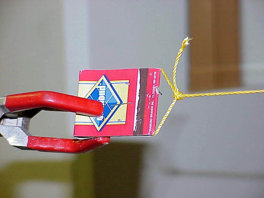 Demo DescriptionA bottle and a match book are tied together by a string. The match book is held in one hand, while the bottle is dangled over a horizontally- held finger of the other hand. Following the directions given below, the match book is released and manages to wrap the string around the horizontal finger of the other hand rapidly enough to arrest the fall of the bottle. |