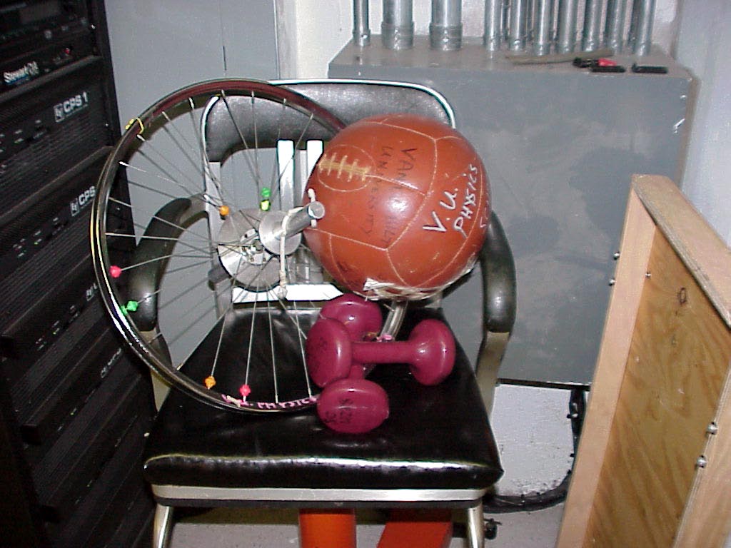 Demo DescriptionA medicine ball is thrown from a sitting position in a low frictional torque chair. It is found that throwing one handed off axis produces a net spin of chair and demonstrator. |