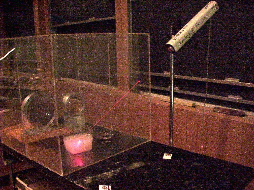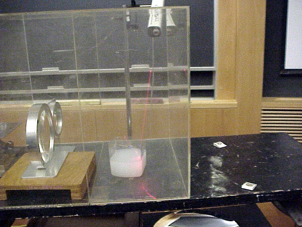 Demo DescriptionIntroduce a beam from a strong laser outside of a smoke box and watch it being refracted into a container of soapy water inside the box. |