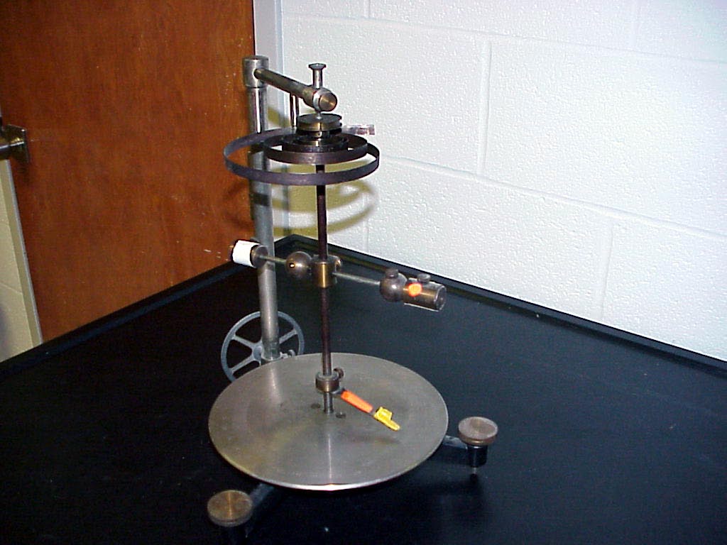Demo DescriptionAn old torsional pendulum may be used to illustrate torsional harmonic motion. |