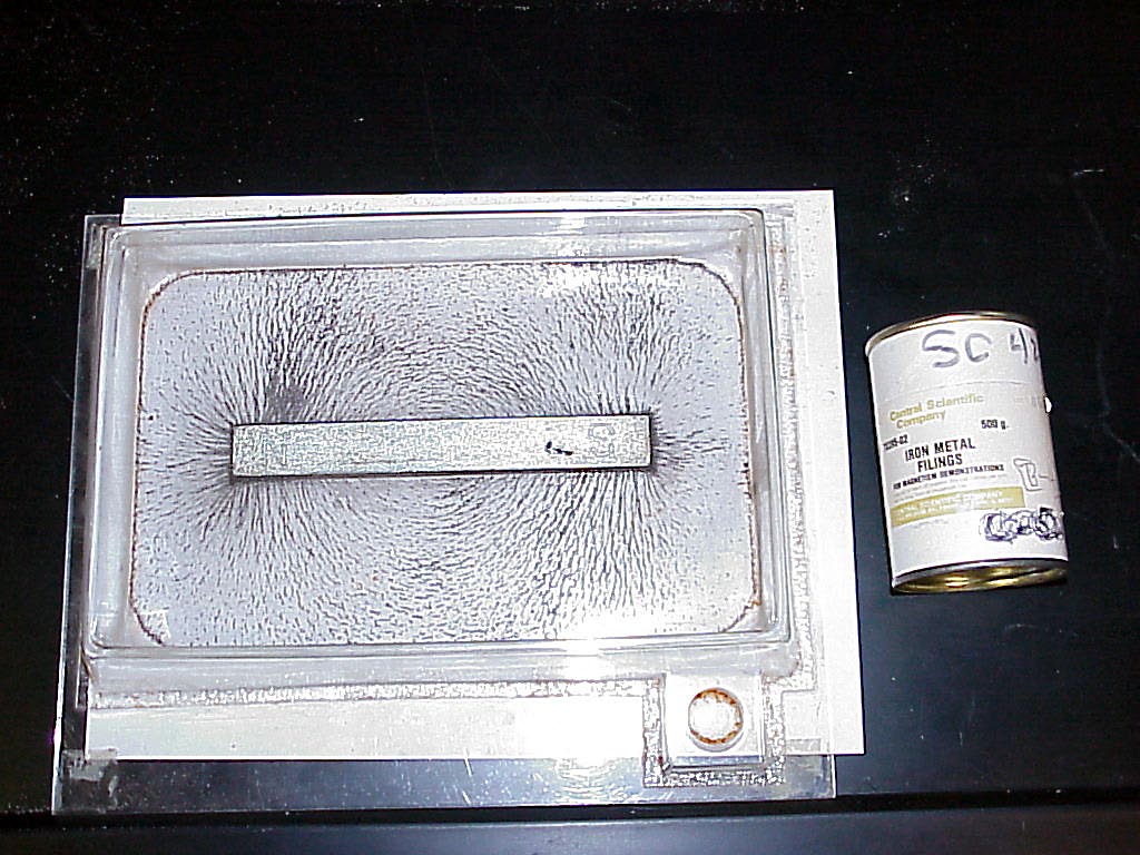 Demo DescriptionA permanent Bar Magnet is enclosed in a transparent housing designed to be put on an overhead projector. Iron filings may then be sprinkled lightly in the plastic well formed by the magnet housing and their patterns observed. |