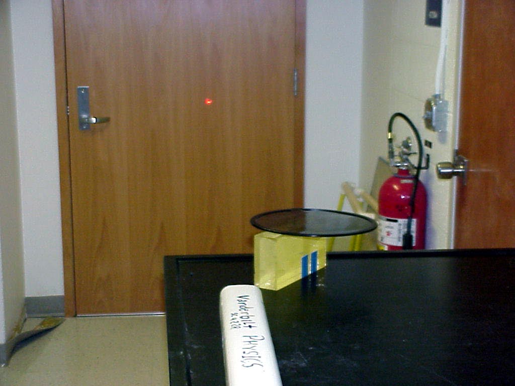 One now slides the block over to intercept the laser beam on the front face of the block. This results in a reflected beam angling over to the wall behind the table on the right in the photo. The second photo shows this state of affairs, for the laser beam striking the block,