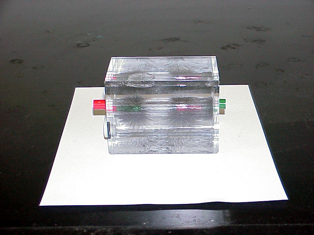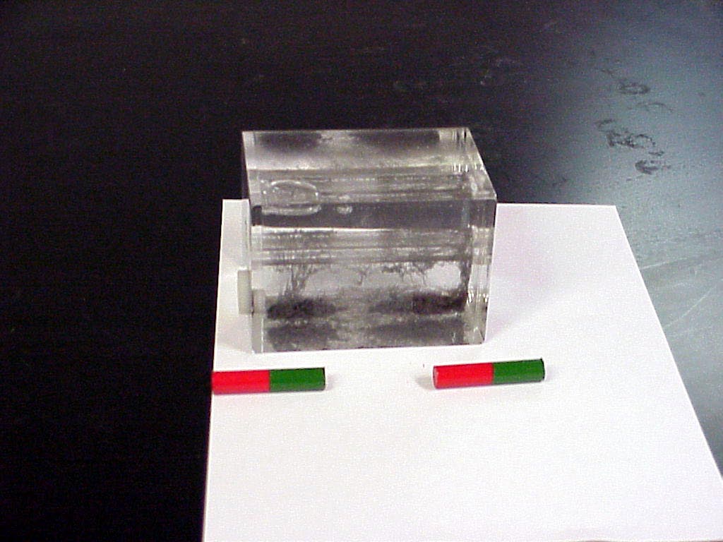 Demo DescriptionOne may use a cube of plastic with an internal fluid containing gravitationally-suspended tiny magnetic dipoles, to obtain a three dimensional map of the magnetic field lines around a permanent magnet. |
